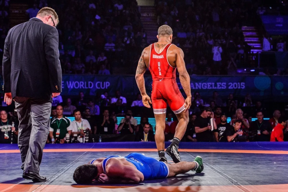 Vladimer Khinchegashvili (Georgia) hit the "super-duck heard around the world" for the 2015 title and is back this year for Olympic glory. At the World Cup, Daniel Dennis actually got a takedown and two guts at the World Cup to take a 6-0 lead, but the Georgian stormed back to create a tough situation to pin Dennis.