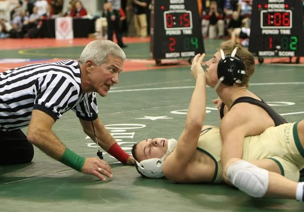 - When someone gets a takedown or reversal right to a count, it's tough for the ref to get into a position to call the pin, give the signal for the takedown/reversal, AND count near fall visually. I absolutely cringe at seeing refs give "2...reversal....one...." and then not give near fall. They are so busy giving the reversal signal and somehow think they can't start counting near fall until they're done signalling to the table that there has been a reversal or a takedown. It absolutely drives me nuts.